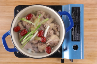 3、锅中加入水1000毫升,放入鸡块、猪肚、红枣、姜片、葱花烧开,改小火加盖煲100分钟