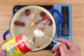 4、后视老鸡酥烂(按个人喜好调整老鸡老嫩)加入美极鲜鸡粉、枸杞烧开撒入葱花即可