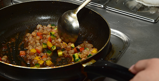 2、另锅下油爆香豆豉酱、蚝油。倒入黄瓜、黄红椒粒翻炒片刻。