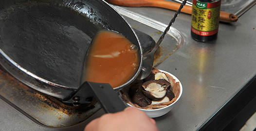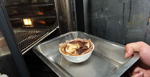 4、上笼蒸90分钟左右后拿出将鲍汁倒入锅中勾芡,将小碗倒扣至盘中淋上勾芡的鲍汁即可。