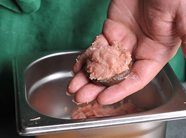 2、泡好的花菇去蒂,沾上生粉,把做好的肉糜酿入花菇中;