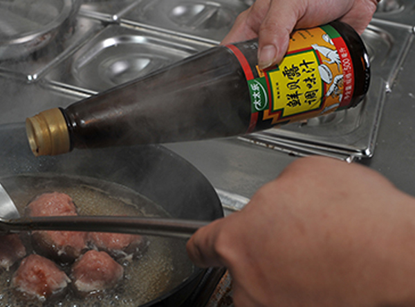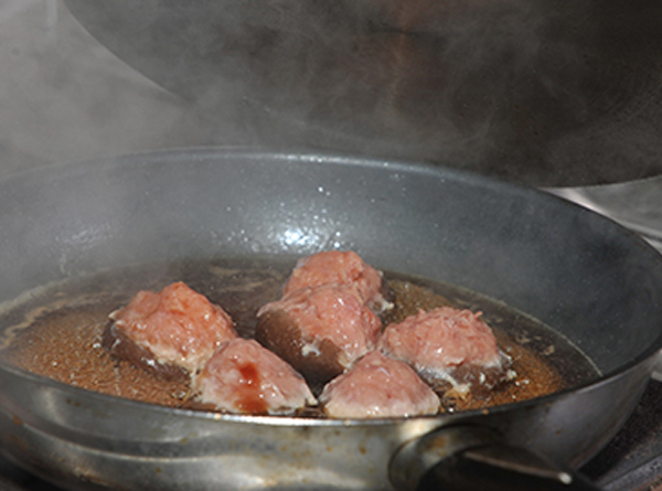 4、把花菇酿肉盛起,余下的汤汁中加入一点蚝油,麻油,勾入水淀粉做成芡汁,把做好的芡汁淋上花菇酿肉上即成。