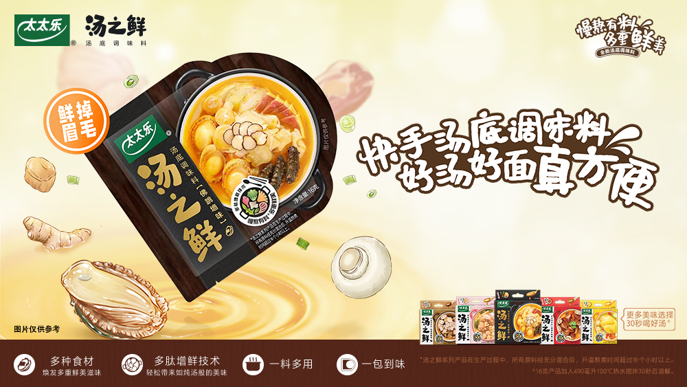 太太乐汤之鲜受到源远流长的汤文化启发,以现代科技还原传统汤底,从多种食材提取鲜味精华,无需花长时间熬制,即可为消费者带来上手简便、鲜味醇厚的汤底调味料,满足消费者多种烹饪场景需求。
